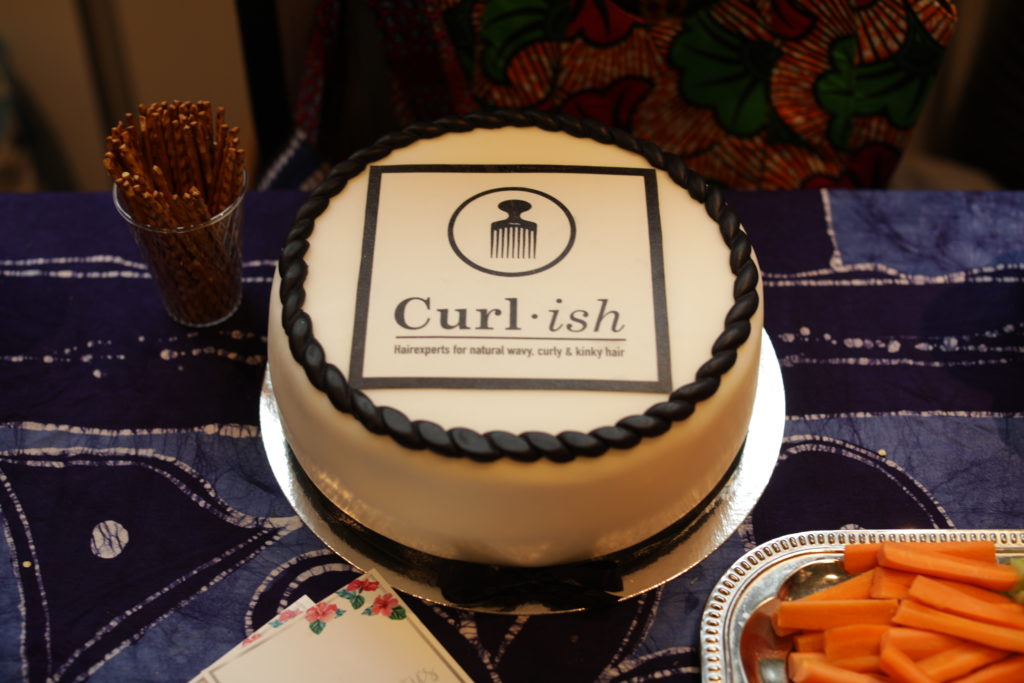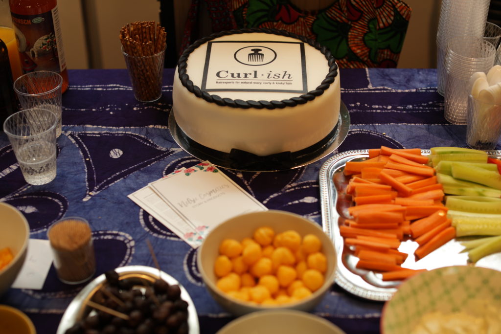 Genau.. Es gab noch einen Tisch mit feinen Snacks und Drinks für unsere lieben Gäste. Die Krönung auf dem besagten Tisch war der Kuchen mit unserem Curl–ish Logo darauf. Der Kuchen war eine Augenweide. Wie er geschmeckt hat? Einfach köstlich! Biscuit mit Vanille Geschmack und die Füllung mit Schokolode. Hmmmm…